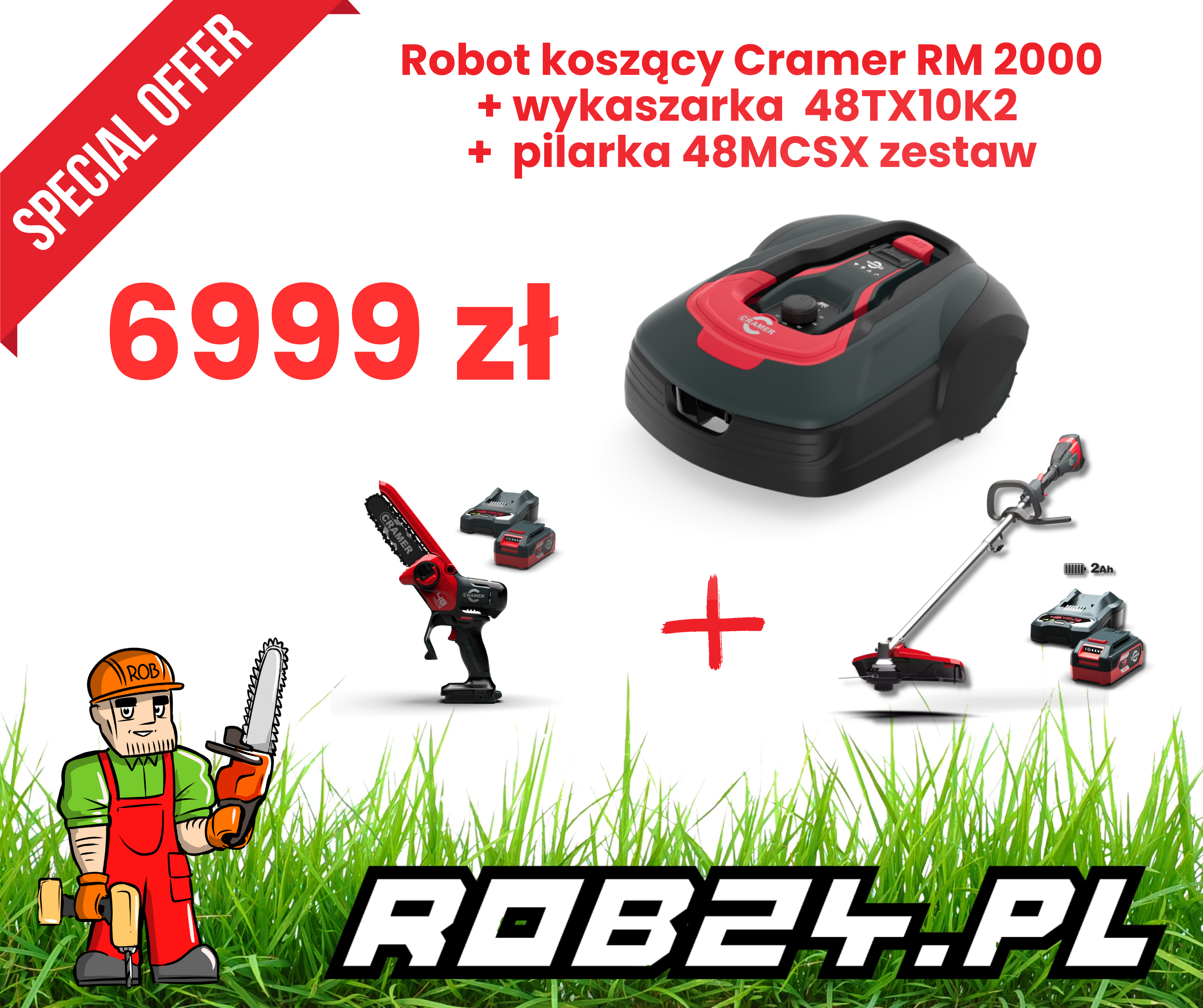 Zestaw Cramer 48V w promocyjnej cenie: wykaszarka akumulatorowa 48TX10, kompaktowa pilarka 48MCSX oraz robot koszący RM2000 z łącznością GSM i GPS. Pełna wymienność akumulatorów w serii 48V — mniej spalin, niższe koszty eksploatacji i większy komfort pracy. Idealne rozwiązanie dla ogrodów do 2000 m².